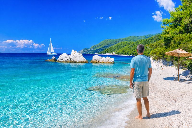 De kustlijn van Skopelos is afwisselend en grotendeels ongerept. Je vindt er kiezelstranden met helderblauw water, maar ook kleine baaien die verscholen liggen tussen rotsen en groen. Veel stranden zijn rustig en ruim opgezet, waardoor ontspanning vanzelfsprekend wordt.